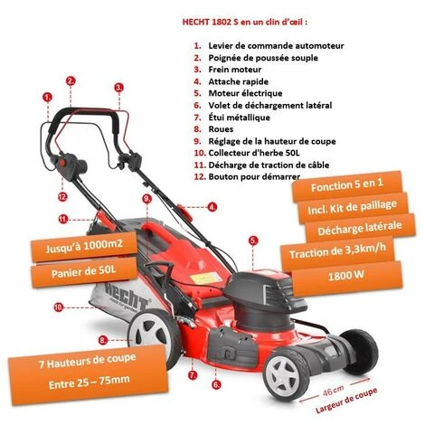 BBLOISIRAM Hecht 1802 S Tondeuse à Gazon électrique 5en1 1800W Largeur Coupe 46cm Bac 50L 7hauteur De Coupe 25-75mm