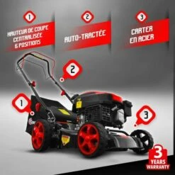 Cette tondeuse à gazon autoportée dispose de 4 vitesses avant (1.5/2/3/4.6 km/h) ainsi que d’une vitesse arrière (2.3 km/h) afin de vous garantir un meilleur contrôle lors de la tonte.