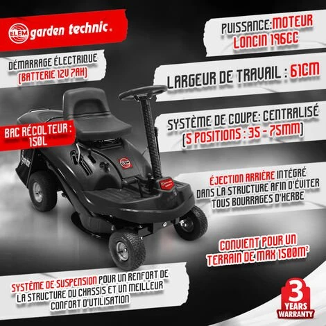 Cette tondeuse rider à démarrage électrique 61 cm de la marque Elem Garden Technic est équipée d’un moteur Loncin 196 cc – 4.8 KW. Elle est idéale pour la tonte de grande surface. Elle possède un système de réglage centralisé qui permet de modifier facilement la hauteur de coupe selon vos besoins (5 positions entre 35 et 75 mm).