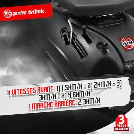 – 4 vitesses avant: 1) 1,5km/h – 2) 2km/h – 3) 3km/h – 4) 4,6km/h
